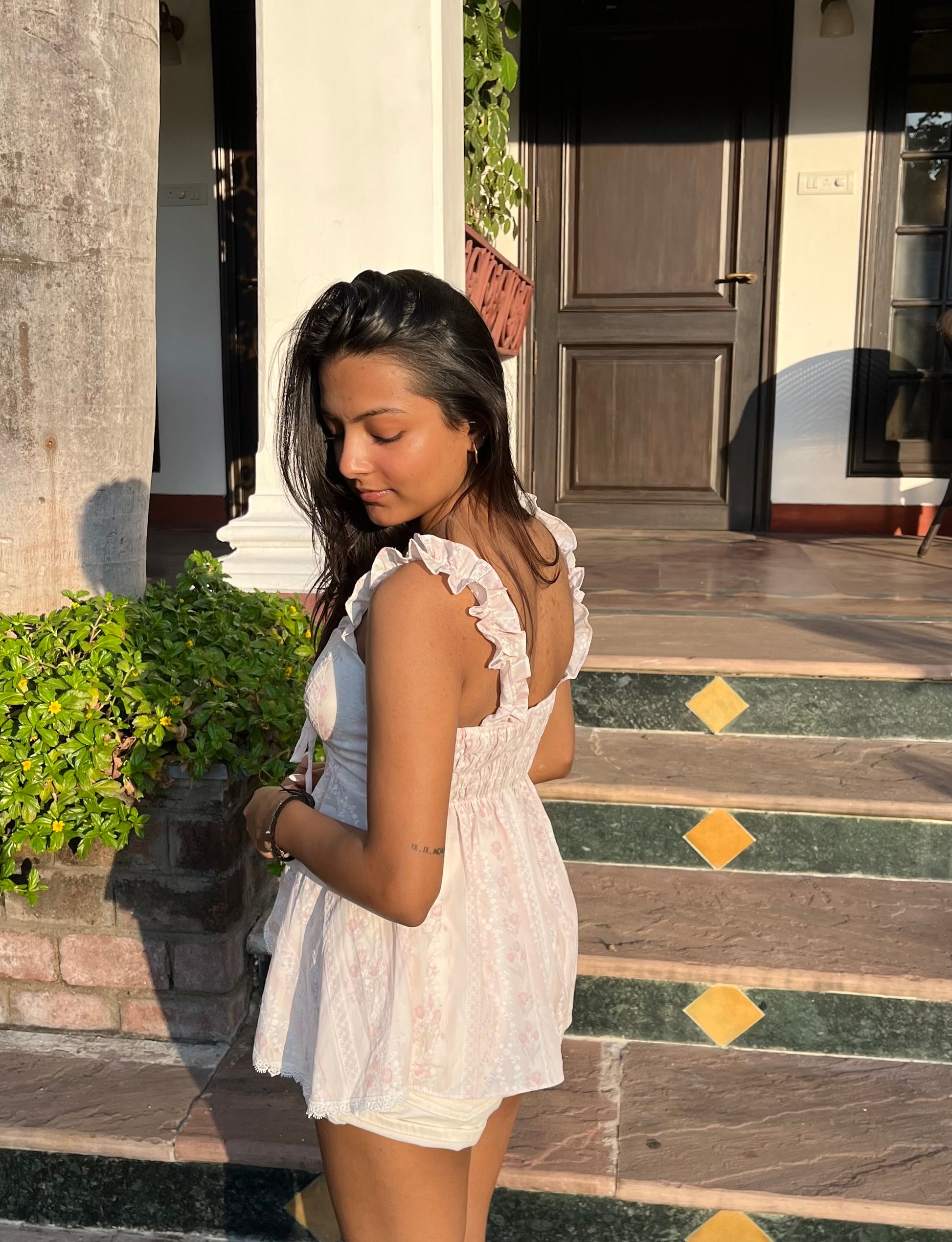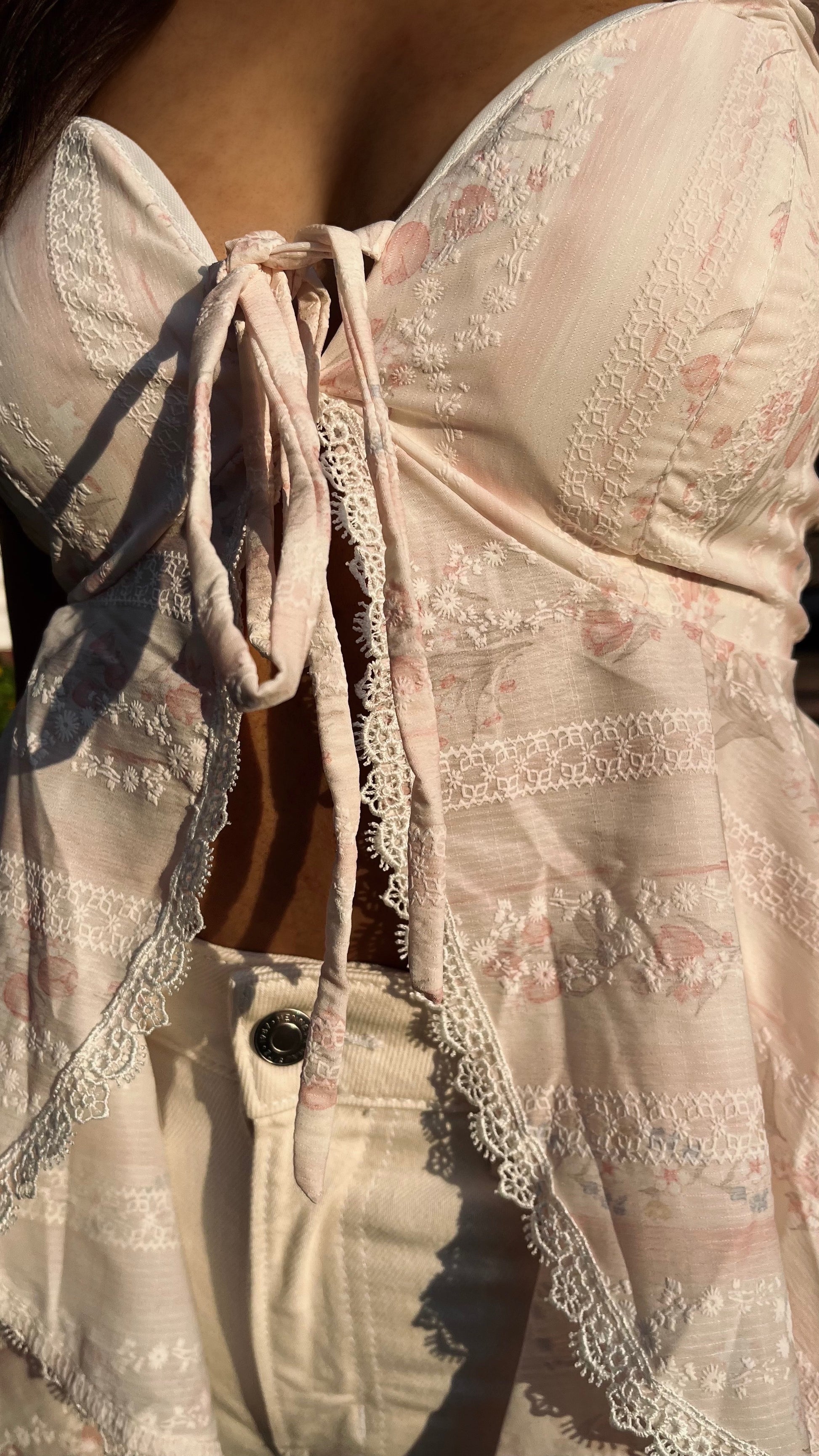 Top featuring embossed floral detailing with lace accents and a front tie-up padded top. Designed with a soft, flowy fit and a delicate finish that sits comfortably on the body.